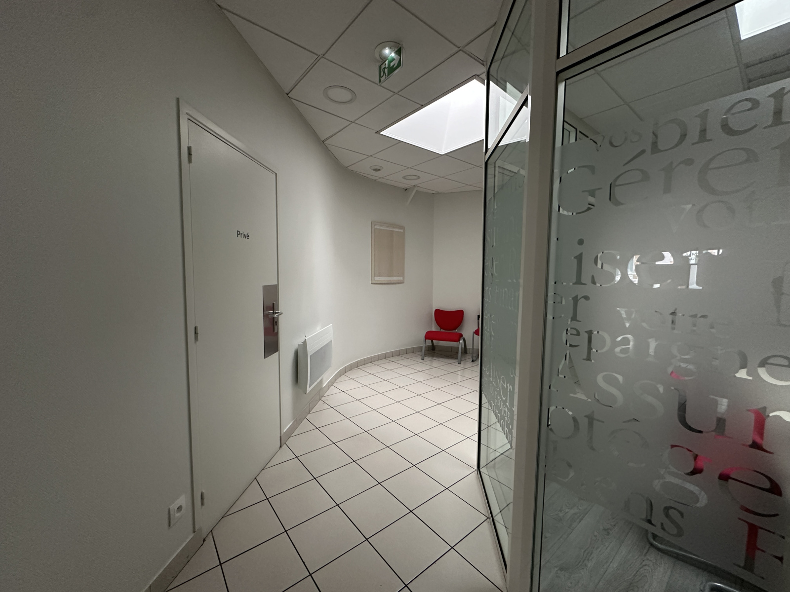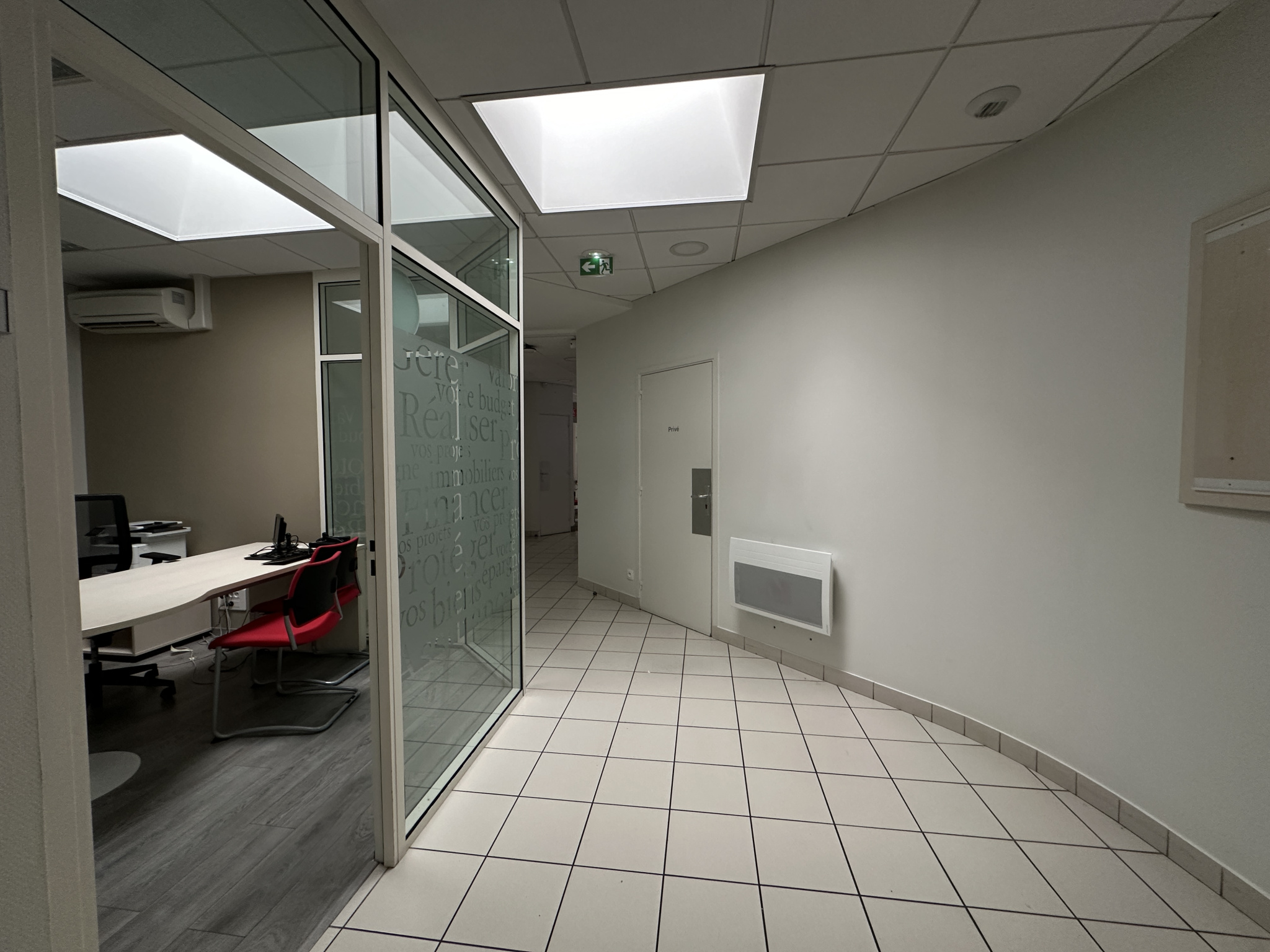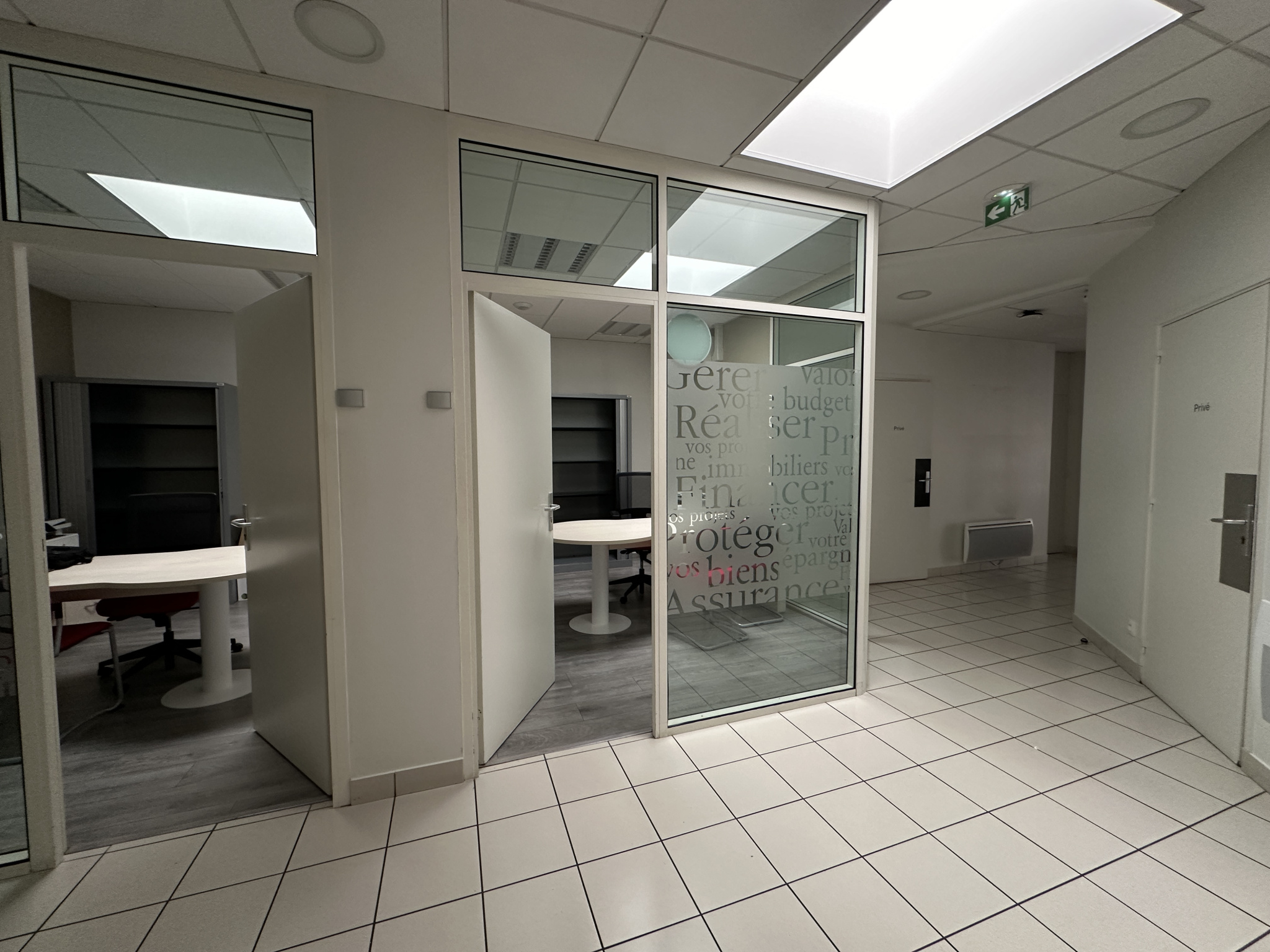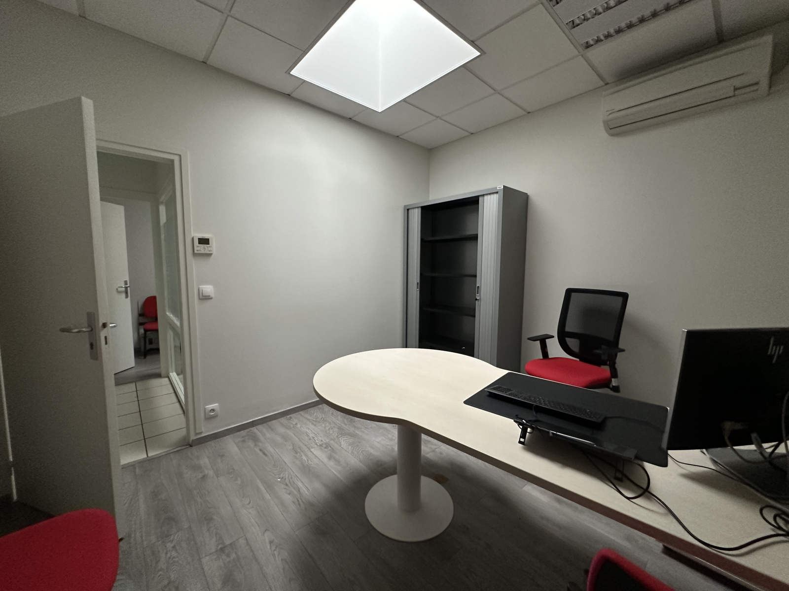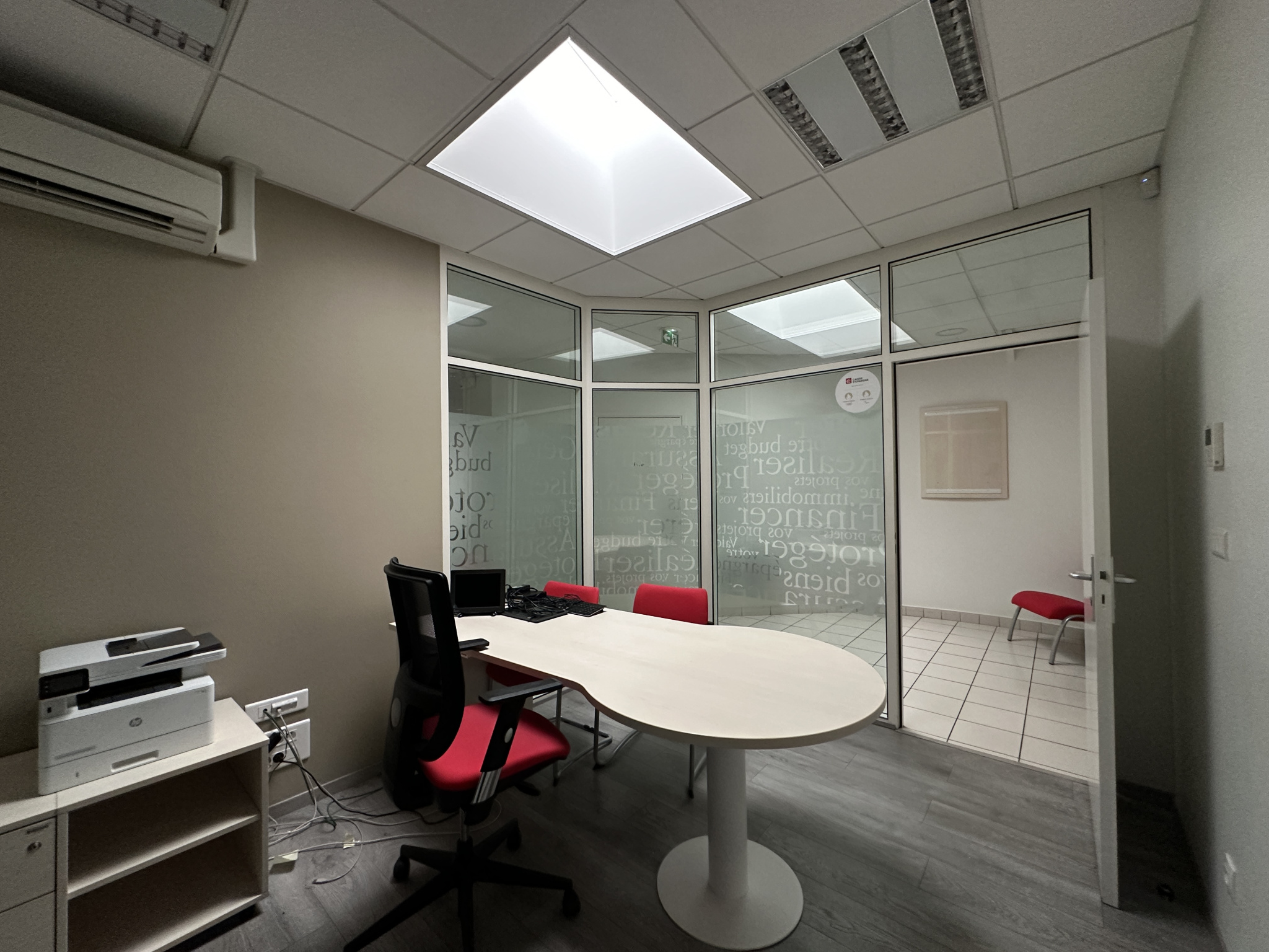 Le rez-de-chaussée s’ouvre sur un espace d’accueil de 39,79 m², un dégagement conduisant à 4 bureaux indépendants (9,70 m² / 9,86 m² / 9,88 m² / 10,25 m², tous équipés d’un puits de lumière), un local informatique, une remise et un espace cuisine / sanitaires.