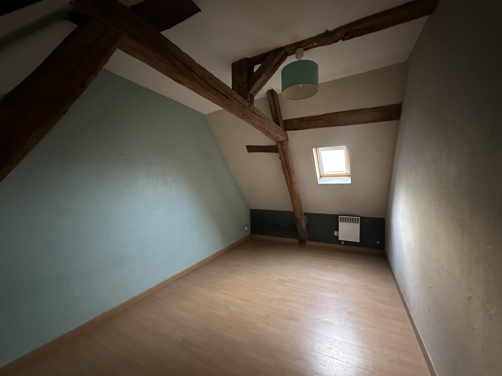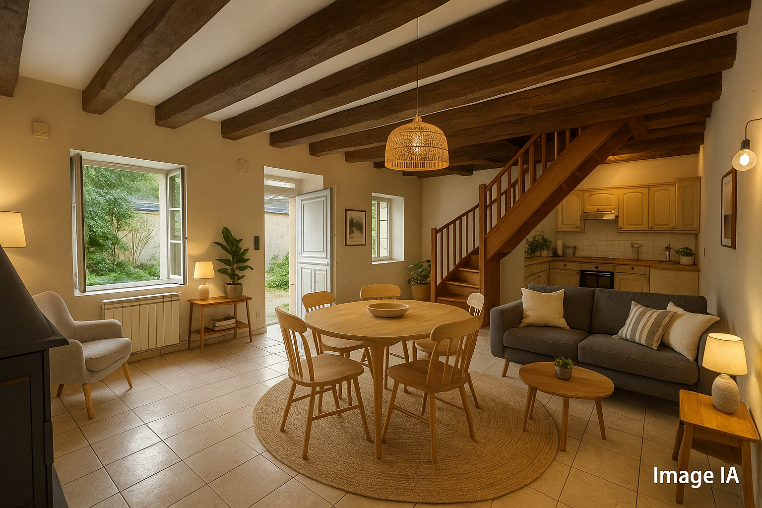 La maison comprend au rez-de-chaussée un séjour avec cuisine ouverte et poêle à bois, une chambre, une salle de bains et des WC. À l’étage : palier, deux chambres et un bureau.