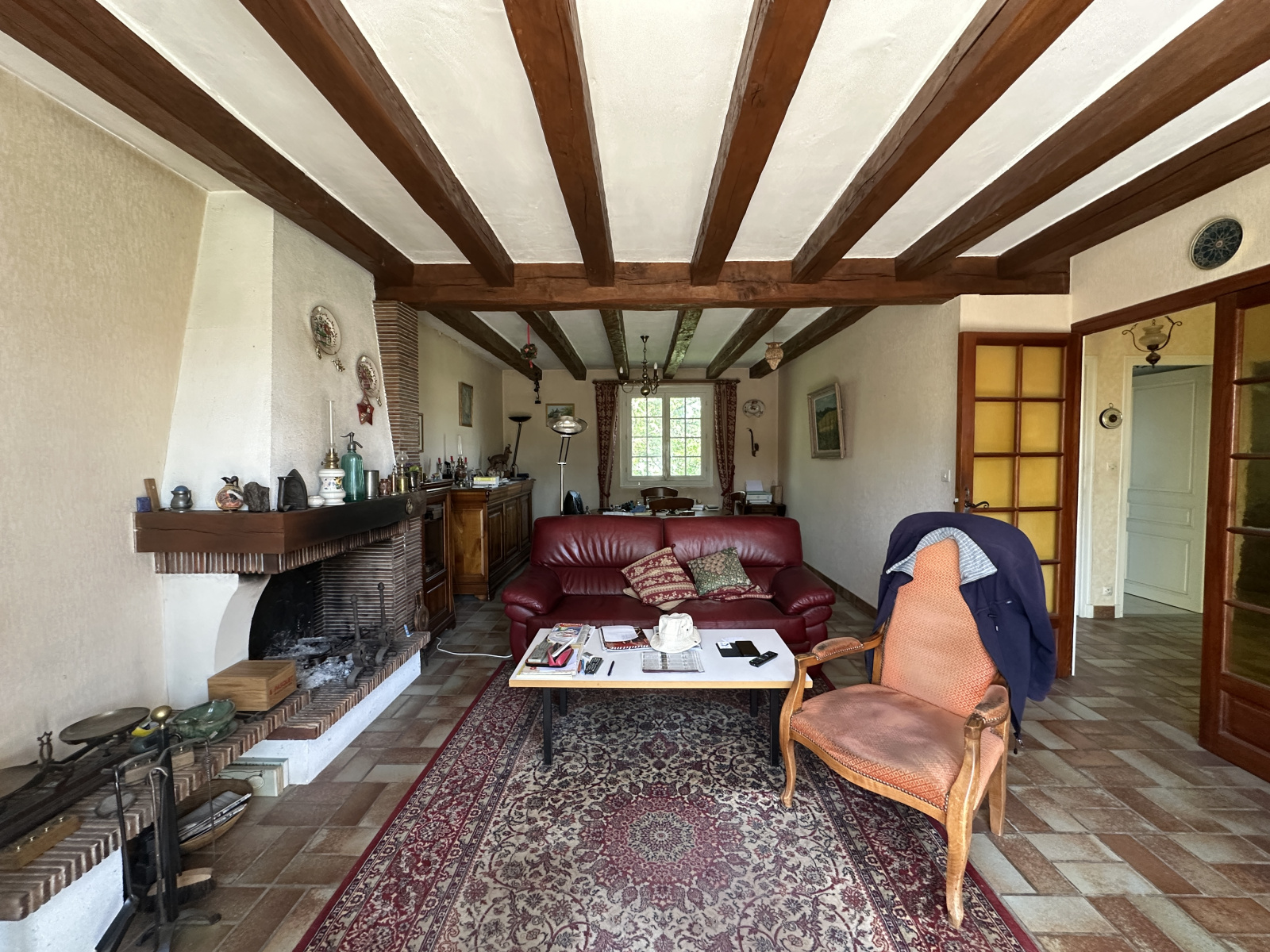 Séjour de 30 m² avec cheminée à foyer ouvert et porte-fenêtre s’ouvrant sur une terrasse exposée plein SUD.