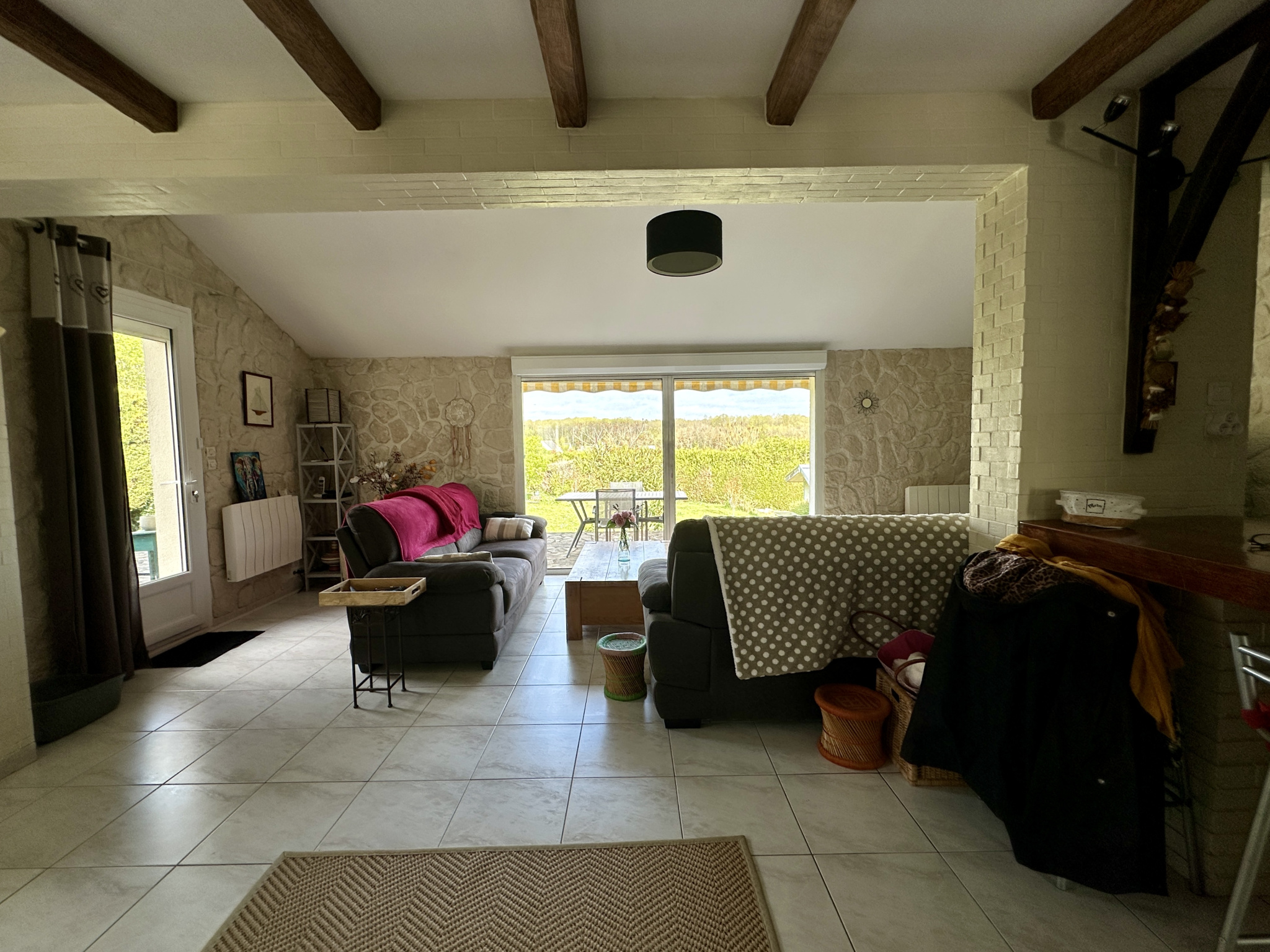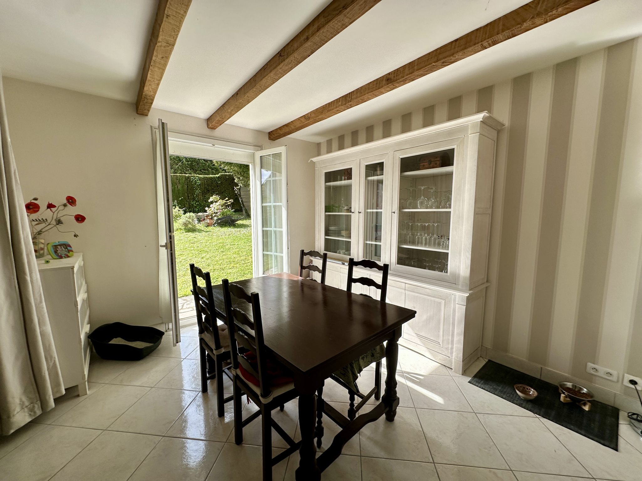 Séjour spacieux de 43 m² avec baie à galandage ouvrant sur une terrasse surplombant un jardin de 945 m², entièrement clos et arboré, sans aucun vis-à-vis. Salle à manger communicante avec le séjour de 12,7 m².