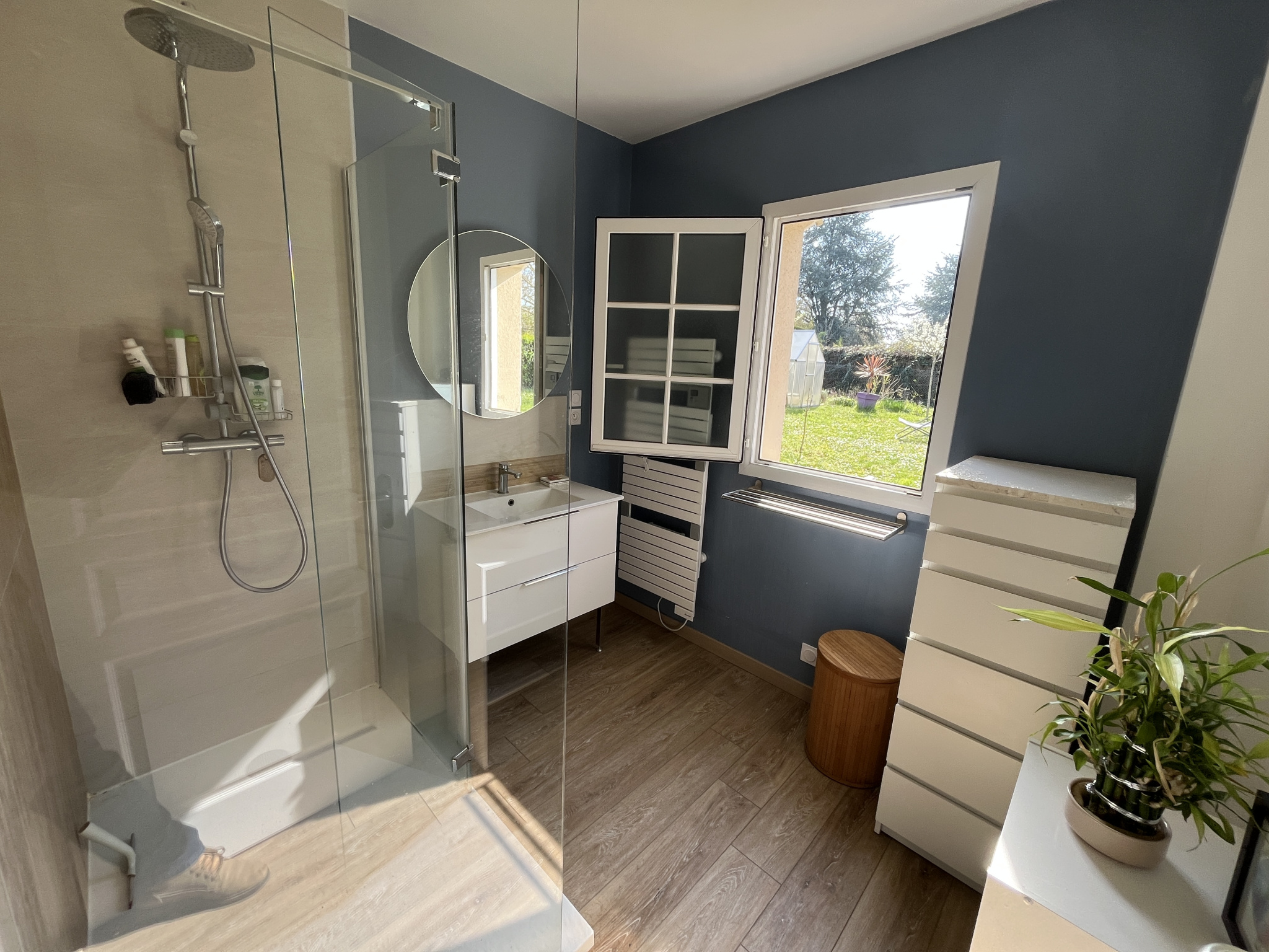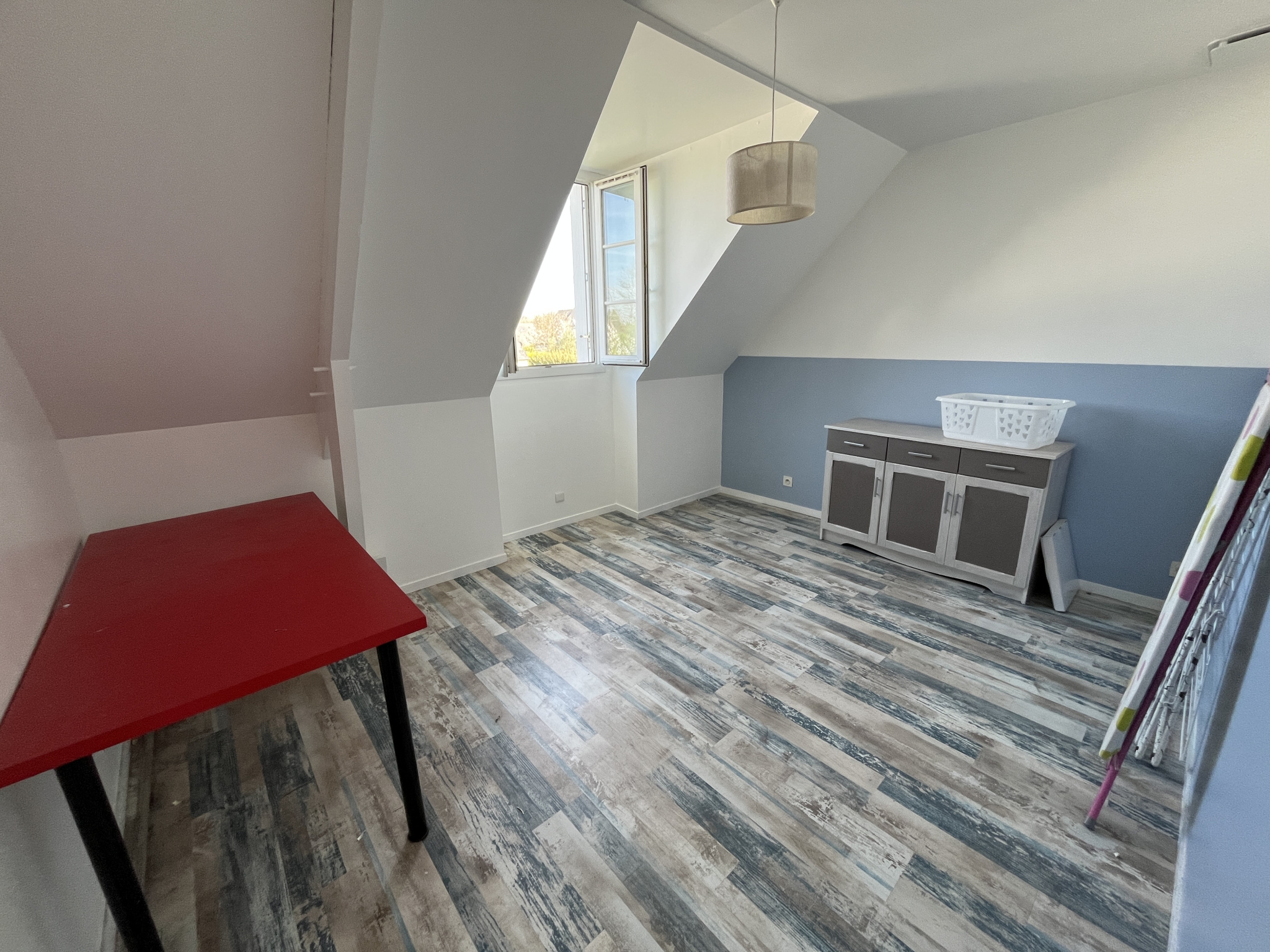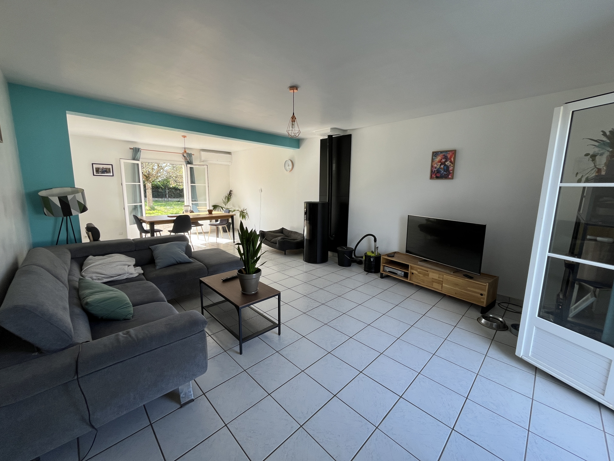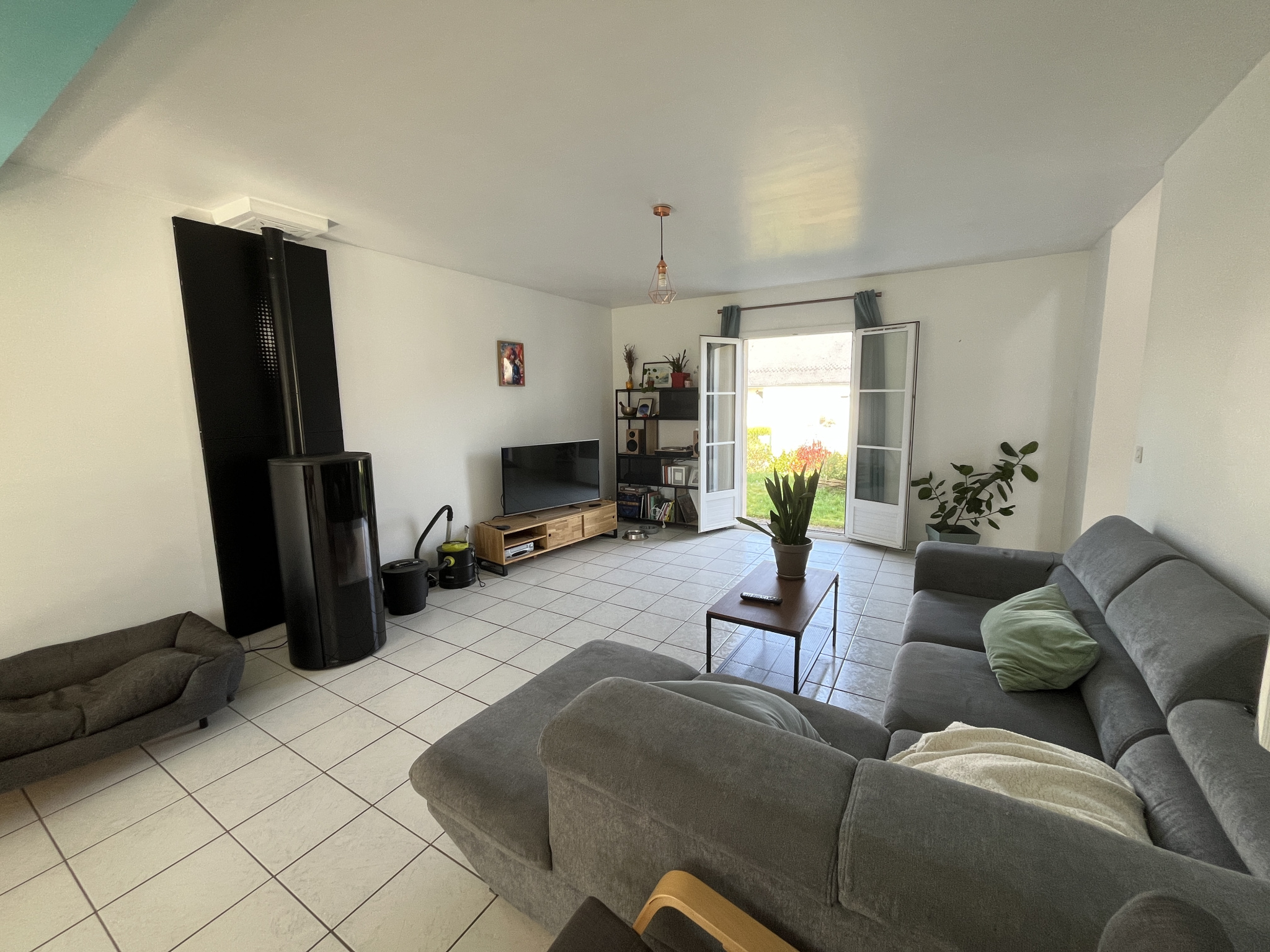Au rez-de-chaussée : Entrée séparée de 11 m², Grand séjour lumineux de 36 m² avec poêle à granulés installé en 2019, Cuisine séparée et aménagée de 12.77 m² (possibilité d’ouverture sur le séjour sans gros travaux), dégagement avec placard, chambre 12 m², salle d’eau moderne 5.58 m², w-c séparés et garage 26.34 m².