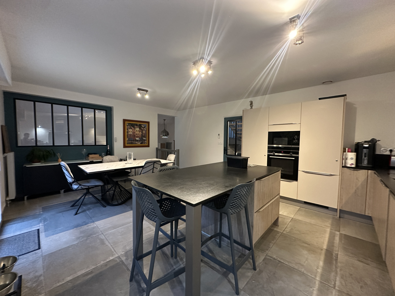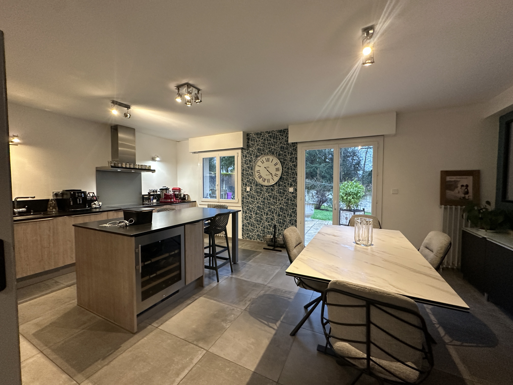 Cuisine dinatoire de 29 m² et salon attenant de 32 m², les deux pièces s’ouvrant sur une vaste terrasse exposée OUEST, avec vue sur le terrain et un environnement arboré.