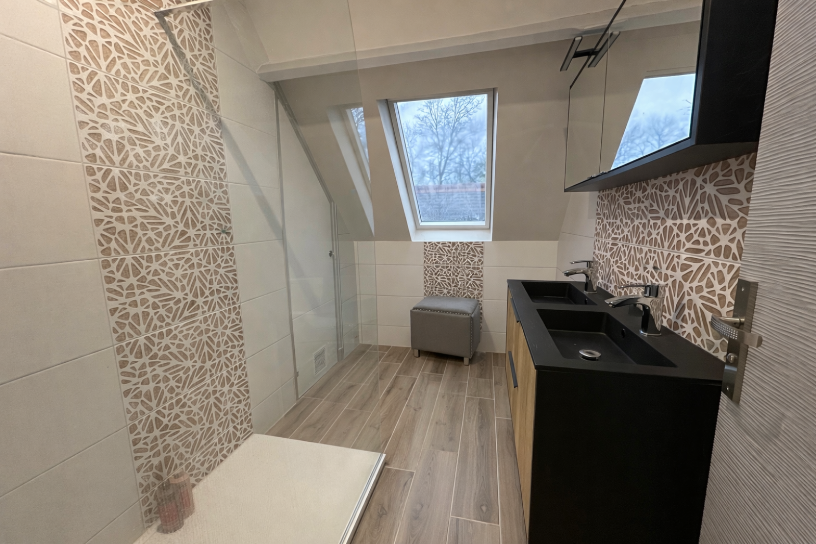 Au rez-de-chaussée : entrée, salon, cuisine dinatoire, dégagement, chambre avec dressins, salle d’eau, lingerie, WC, double garage et l’atelier.