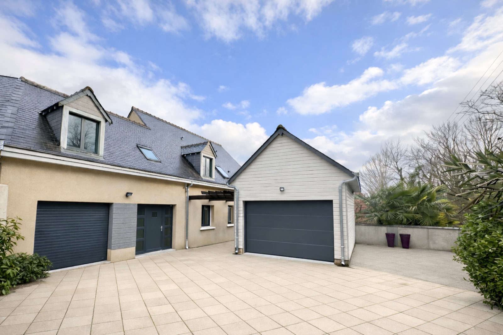 210 m² habitables + double garage (27,5 m²) + atelier (19 m²) + garage indépendant.