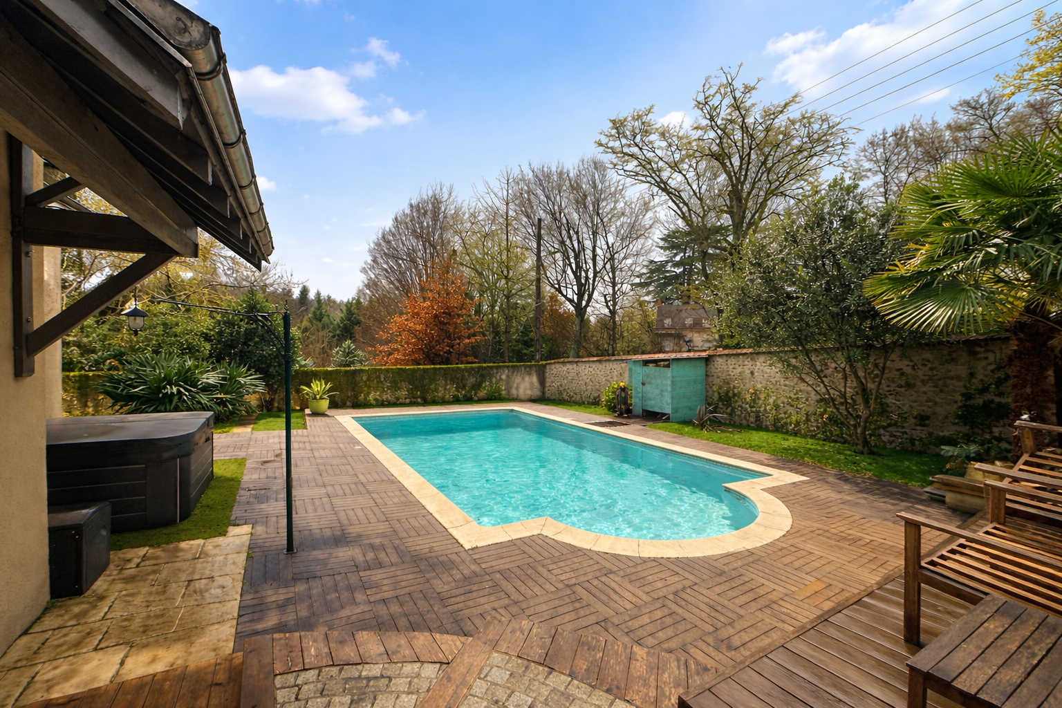 Terrain de 975 m², entièrement clos de murs, sans aucun vis-à-vis, avec piscine chauffée 8 x 4 et vaste surface à l’avant de la propriété permettant d’accueillir 3 à 4 véhicules.